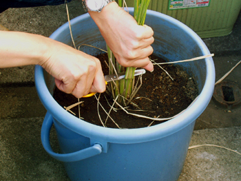 子ども用の小さなはさみを使って、刈り取ってみます。左手で一株ずつしっかりとにぎって、はさみを入れていきますが、刈り取る際は「ざくっ」とおもしろい感触。「小さな子だと、一株いっぺんは難しいかな」など、いろいろ考えながら刈り取っていきました。刈り取るのはあっという間、バケツとペットボトルとプランター、合計13株のイネは10分もしないうちにすべて丸坊主に。でも育てるのは半年以上……ひょろひょろだった苗の頃から、よくここまで育ったものだなあ、と感慨深くなりました。肥料もやらずに、水だけ切らさないように育てていましたが、穂はしっかりと固く、中に米粒の存在が感じられます。