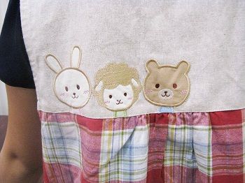保育者のみなさまからご意見をいただき、とってもかわいいエプロンが完成しました。やさしい色味のチェック柄で、ポケットの中からは二匹の動物が飛び出しています。