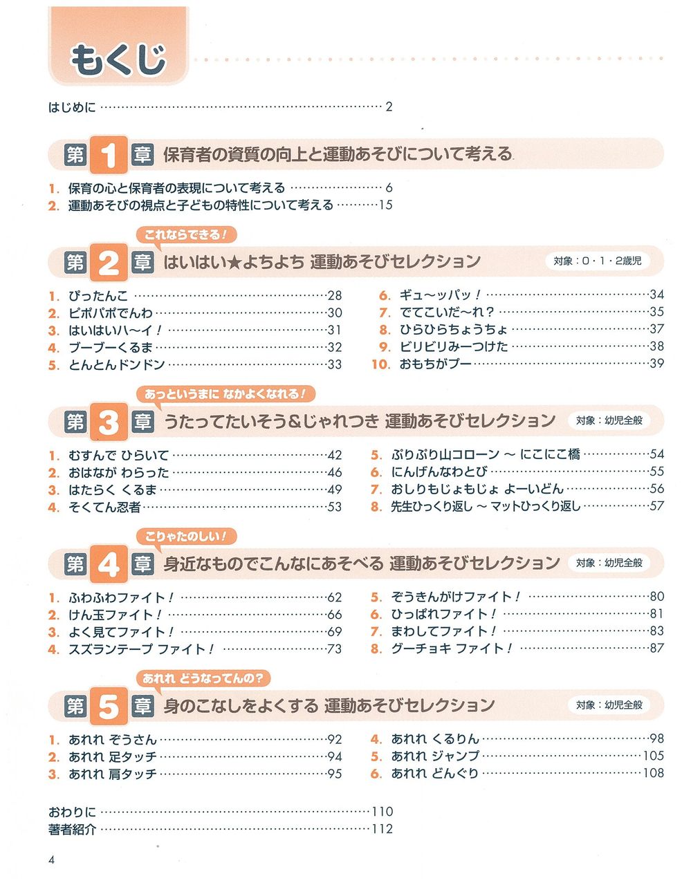 乳児の楽しめるもの、チームでの遊びに発展できるもの、歌に合わせてできるもの、レジ袋やスズランテープを使って楽しめるものなど、アイデアいっぱいの【運動遊び】をたくさん掲載!