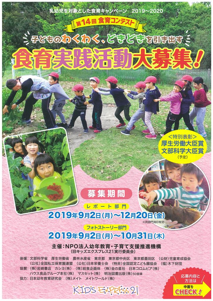 ひとつは、幼稚園・保育所・こども園などでの食育実践活動をレポートしていただく【第14回食育コンテスト】です。