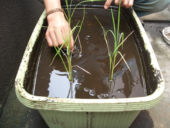 こんにちは。編集部の林です。 JA全中・(株)メイト共同企画「おにぎりパーティーしませんか!!〜田んぼづくりか ら収穫祭まで〜」で、園への種もみプレゼント企画をはじめて2年目になります。ふ だん食べているお米がどのように育つかを、自分の目で見ることができる、米づく り。子どもたちは体験を通して、たくさんのことを感じていくことと思います。 今年は米づくり実施園を300園募集し、たくさんのご応募をいただきました。その中 から5園の活動を毎月ご報告しています。毎月園の先生に送っていただく米づくりの 写真は、いきいきとした子どもたちの笑顔でいっぱい。ぜひご覧ください。 さて、遅まきながら、メイトでも米づくりをはじめました! 芽出し、種まきを終 え、現在すくすくと生長しているところです。1cmにも満たない小さな種もみから、 芽が出て力強く育っていく……生命の不思議にあらためて感動しています。おにぎり パーティーができるように、元気なイネに育てたいと思います! |